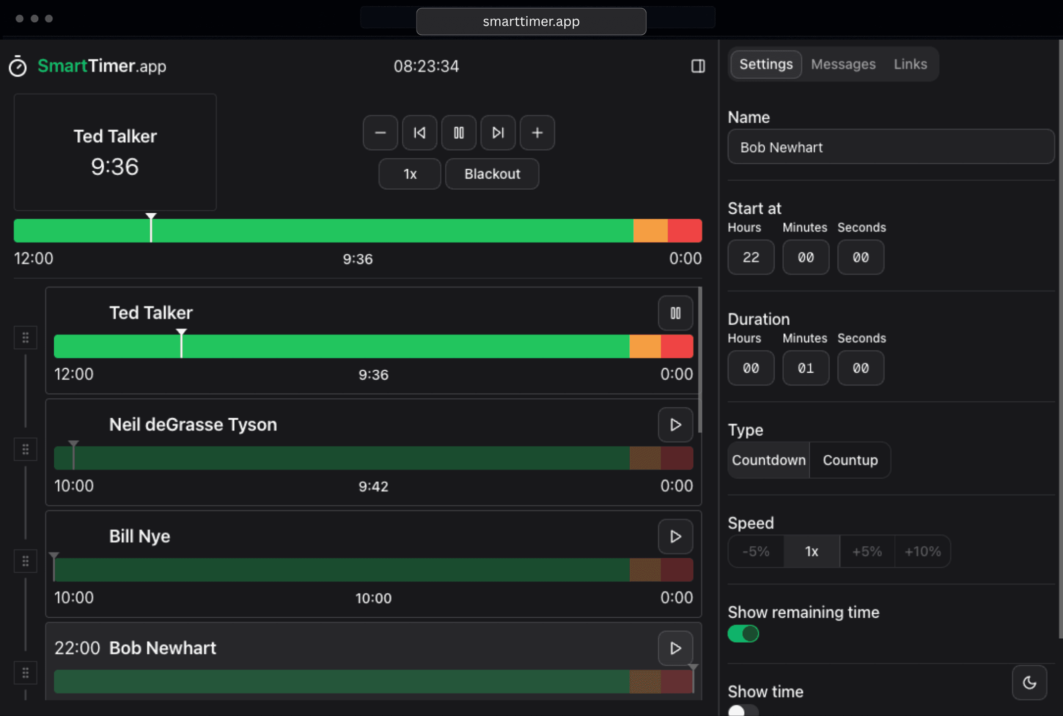 Keep speakers on schedule with live countdown/count-up timers. Adjust durations on the fly, control playback speed, and use visual timeline indicators to maintain perfect event timing without interrupting the flow.
